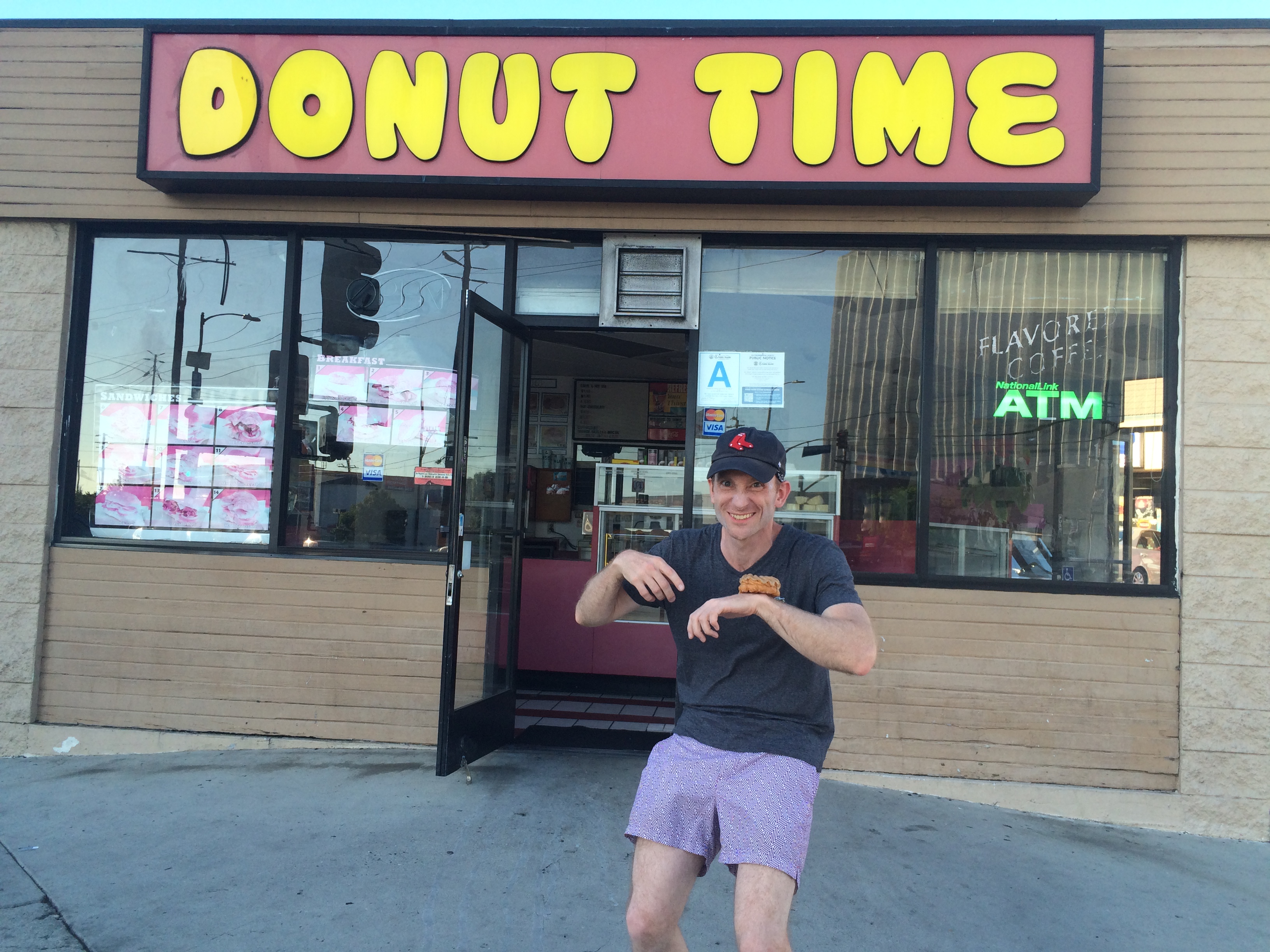 Footnote: I tracked down Donut Time, the donut shop where much of the action in Tangerine takes place. It’s located at 6785 Santa Monica Blvd. at the corner of Highland. I used the ATM and bought a cruller. It was awesome.